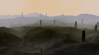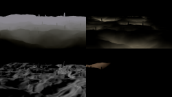 Adding various diffuse point colors based on camera depth (fog), relative height (ground fog), feature masks (shadow) and world position (sun). The image is created right in the viewport.