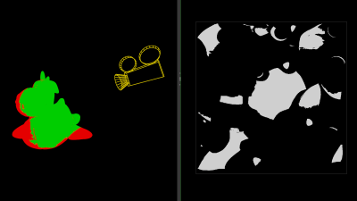 We obtain world positions with primuv(1, 'P', pr, uv); and normal devices coordinates with toNDC(cam, pos);. Normal device coordinates show the point positions as seen by the camera projected to the screen. Then the texture pixels get filtered out by consecutive conditions regarding the cameras frustum: if(p.x..) from the viewing area between left and right of the cameras, if(p.y..) for below the top and above the bottom and if(p.z < 0.0) for the area in front of the camera.