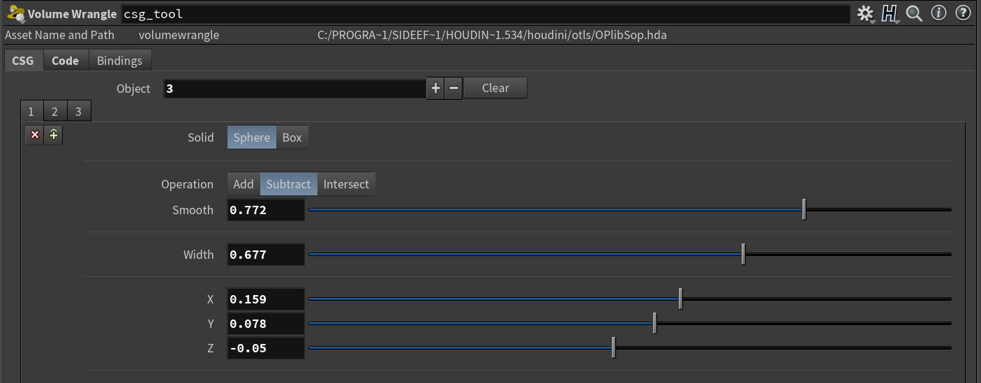 Volume wrangle on a SDF volume. A loop is feeding menu input from a multiparm block into signed distance functions and combines them using boolean operations. sd and op are wrapper functions.