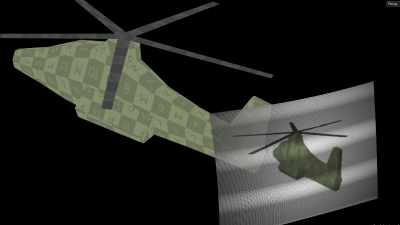A low poly helicopter modelled with a sweep node and extrusions. Projected to a screen using the ray node.