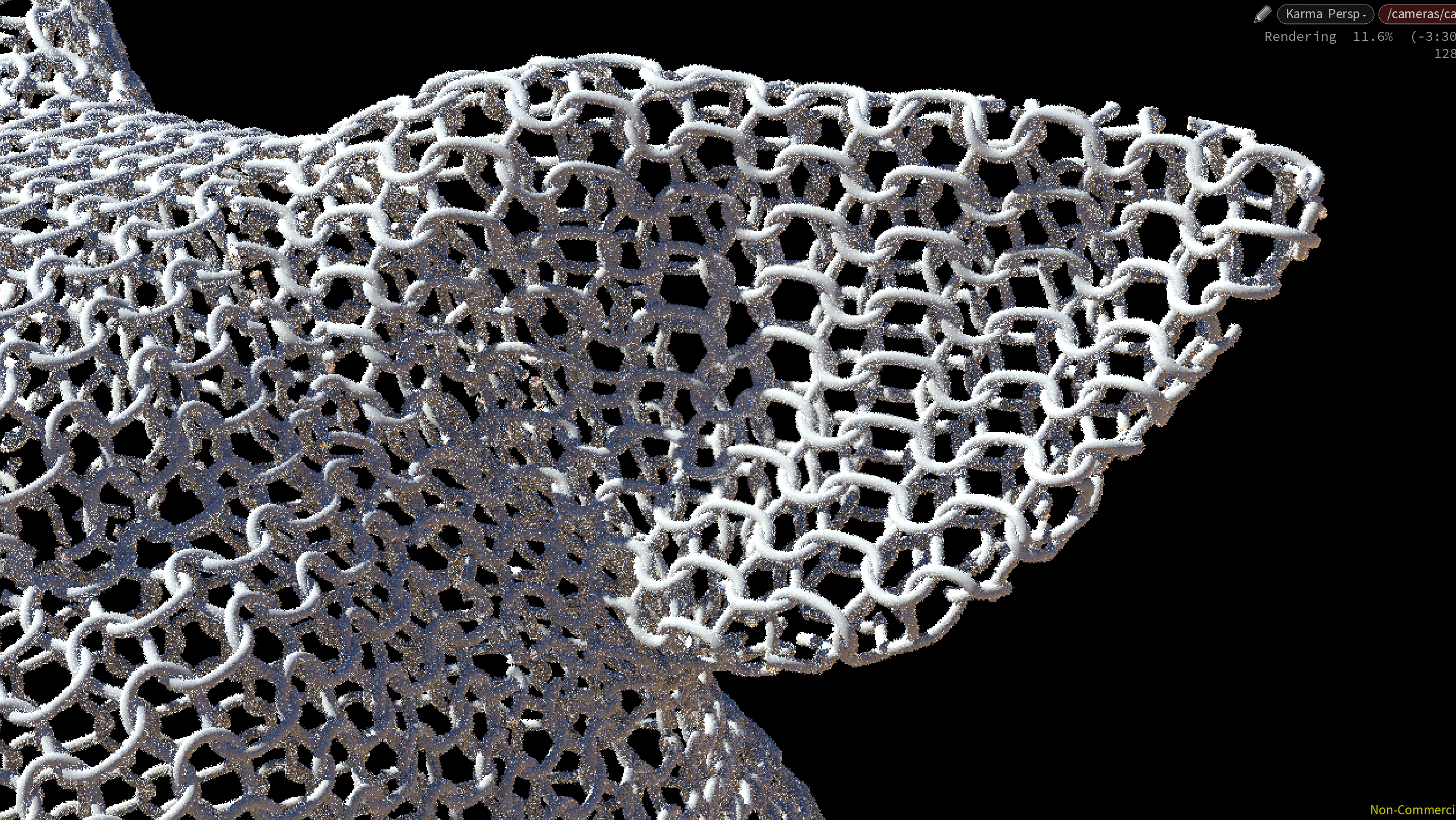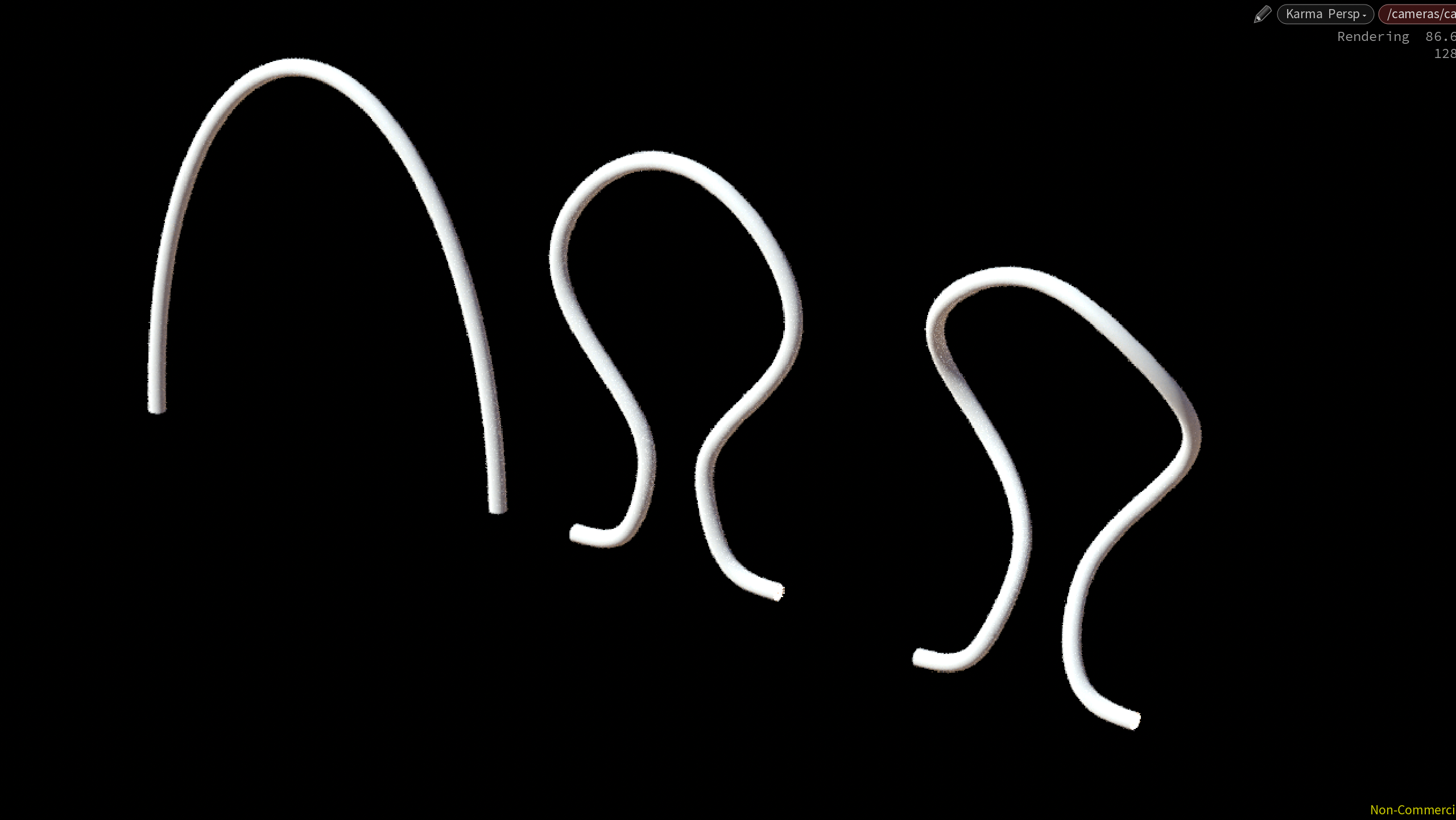 After clipping grid curves when they shoot over the boundaries of the UV islands, the rest position gets assigned to the curves. A point scale defines the width of the curves for rendering in Solaris.