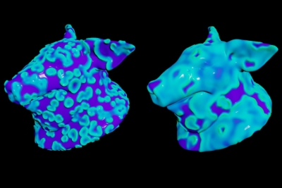 A simple implementation of the reaction diffusion equation using OpenCL kernels for processing and a VEX point wrangle for applying the displacement.