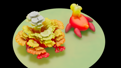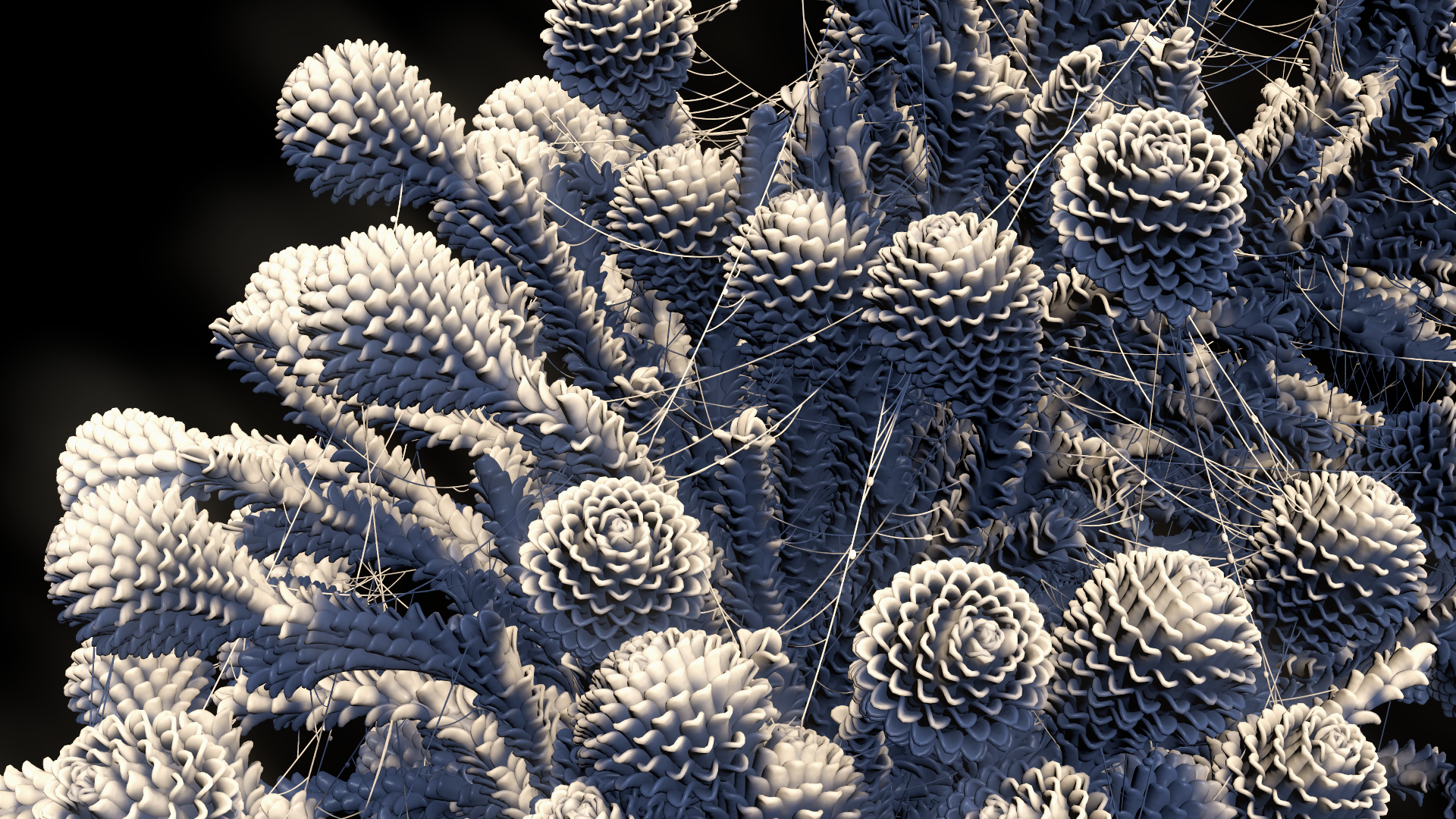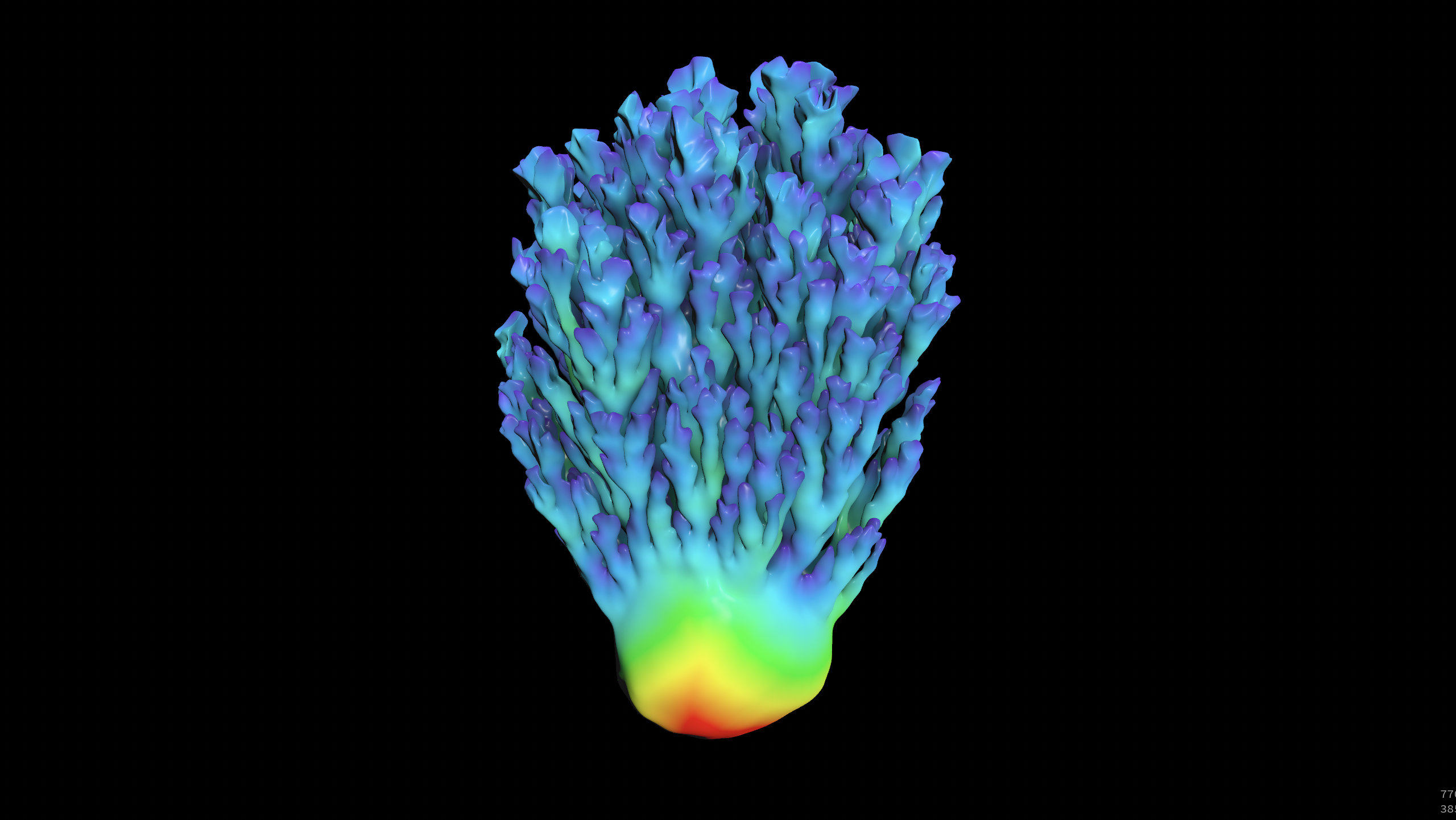 A polygon mesh gets iteratively displaced (and remeshed) based on surface features and normal orientation as well as light exposure.