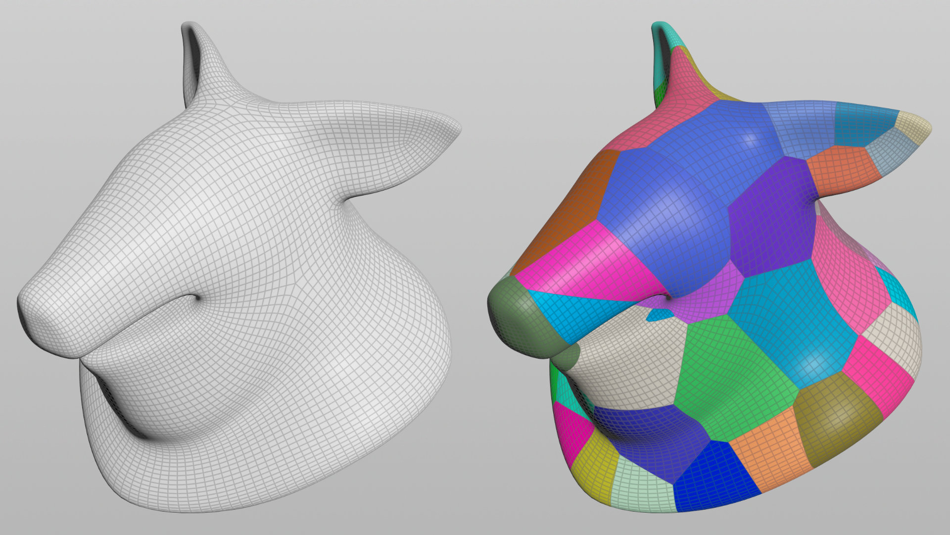First we subdivide a fairly regular mesh to provide enough detail for later displacements. Then a voronoi pattern can be combined with some additional edges that run along sharper areas such as the rims of the ears in our example.