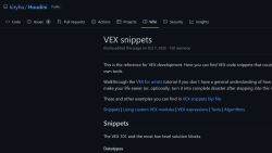 A GitHub wiki providing various VEX snippets for Houdini, offering reusable code for geometry processing and procedural effects.